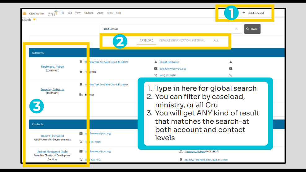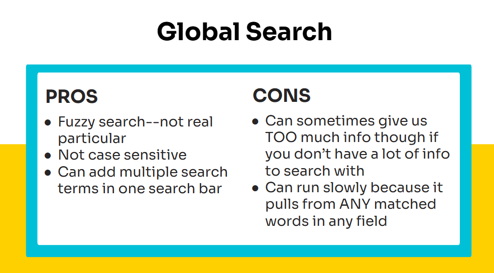 There are two ways to search in the CRM: global searches or precise searches. There are pros and cons to each search type.